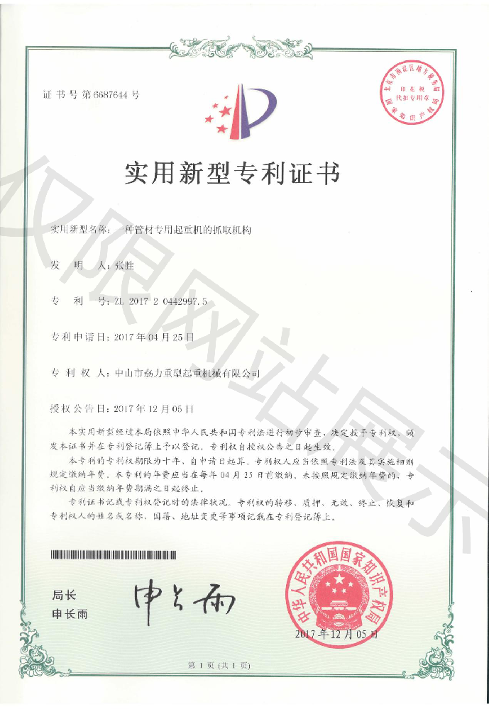 實用新型專利證書 -- 管材專用起重機的抓取機構