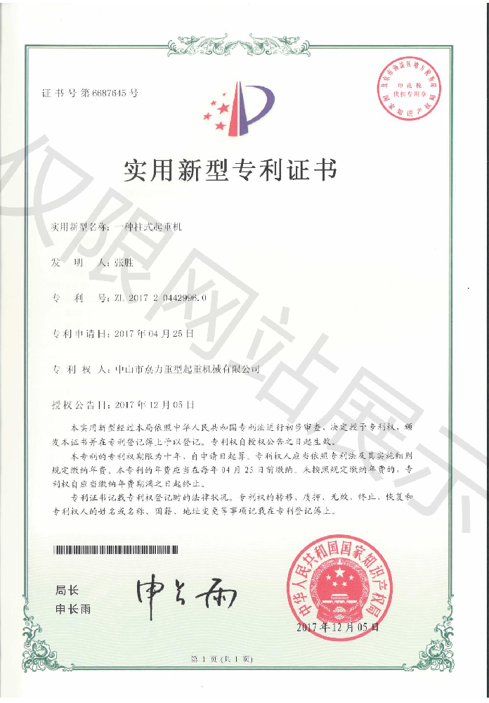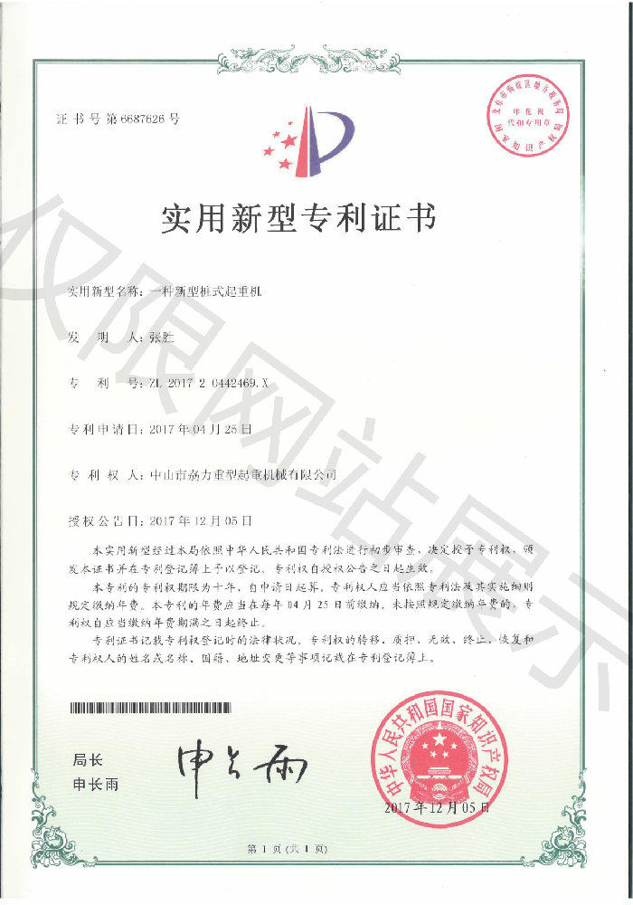 實用新型專利證書 -- 起重機用羊角吊鉤