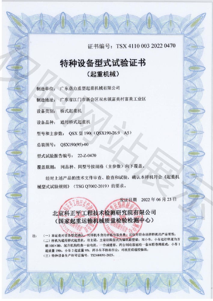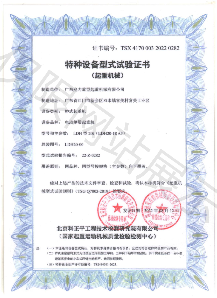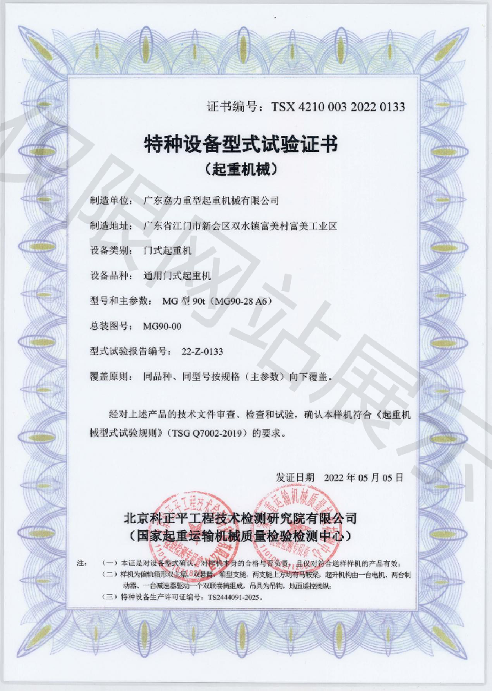特種設備型式試驗證書--電動葫蘆門式起重機